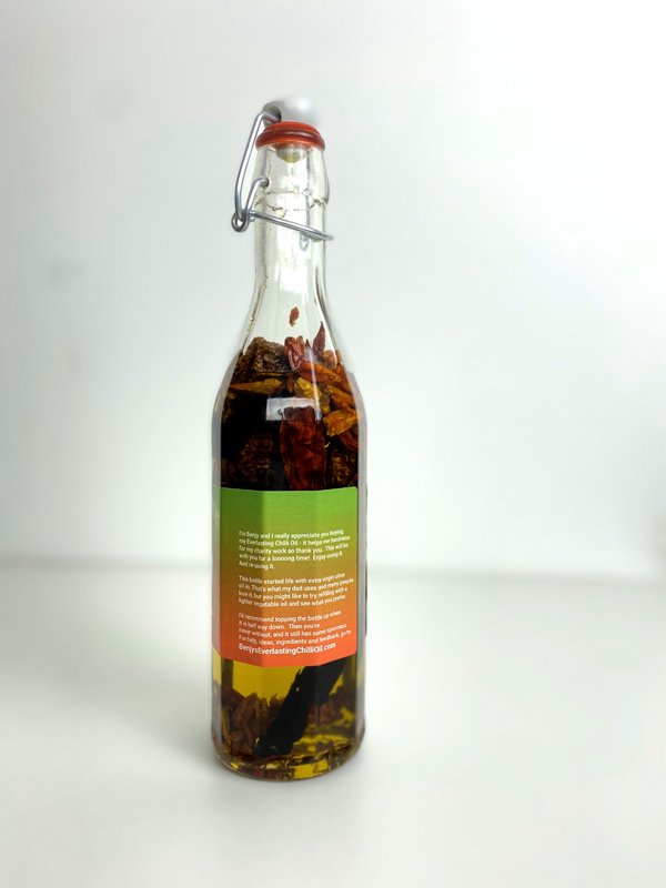 Because the whole chillis in your bottle are forever infusing the oil, it is always in your cupboard to add spice to your meals.